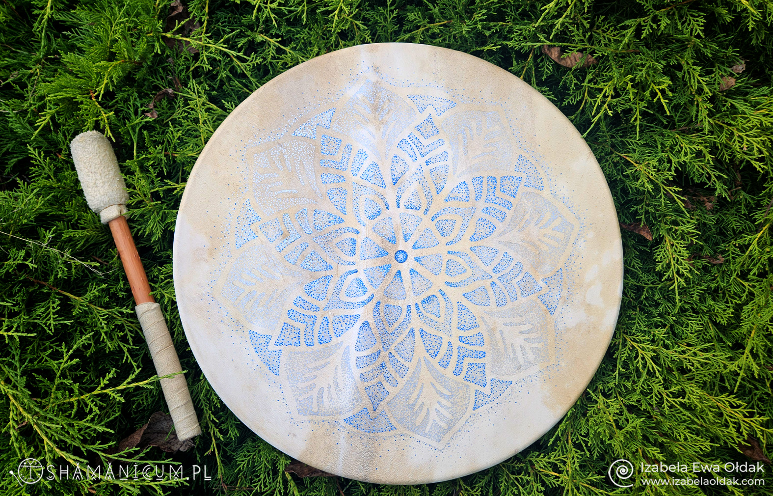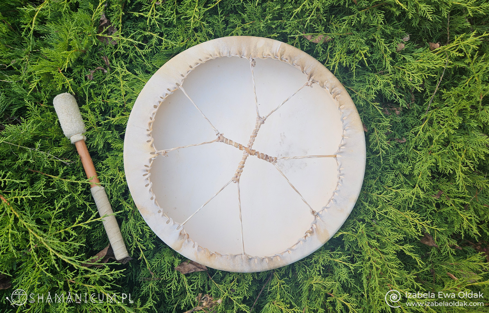 Bębny, które mam w ofercie, łączą w sobie energię męską (wykonanie bębna) i żeńską (dekorowanie go), oraz ducha jelenia, z którego skóry są wykonane. Skóra jelenia jest gruba, dzięki temu bębny mają mocne brzmienie i bas. Naciąg jest stały, ze skóry, co oznacza, że bęben strojony jest ciepłem, poprzez ogrzewanie go jeśli nabierze zbyt dużo wilgoci z otoczenia, a jeśli jest zbytnio nagrzany i wydaje wysokie dźwięki możemy obniżyć ton poprzez przetarcie z tyłu bębna wilgotną szmatką. Niczego nie rozplątujemy i nie wiążemy. Pałeczka również wykonana ze skóry jest w komplecie. Jeśli pałeczka jest dla nas zbyt twarda możemy owinąć ją futerkiem lub filcem, co zmieni także dźwięk bębna.