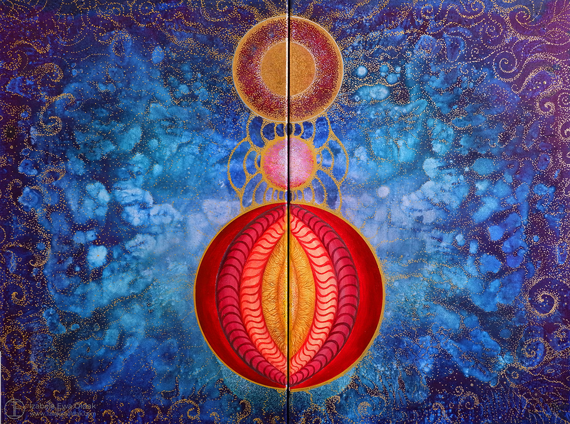 Dolna sfera, w intensywnych czerwieniach i złocieniach, ukazuje łono Ziemi jako pierwotną matrycę ciała i materii. Jest to obszar, w którym rodzi się doświadczenie, zmysłowość i ucieleśnienie.