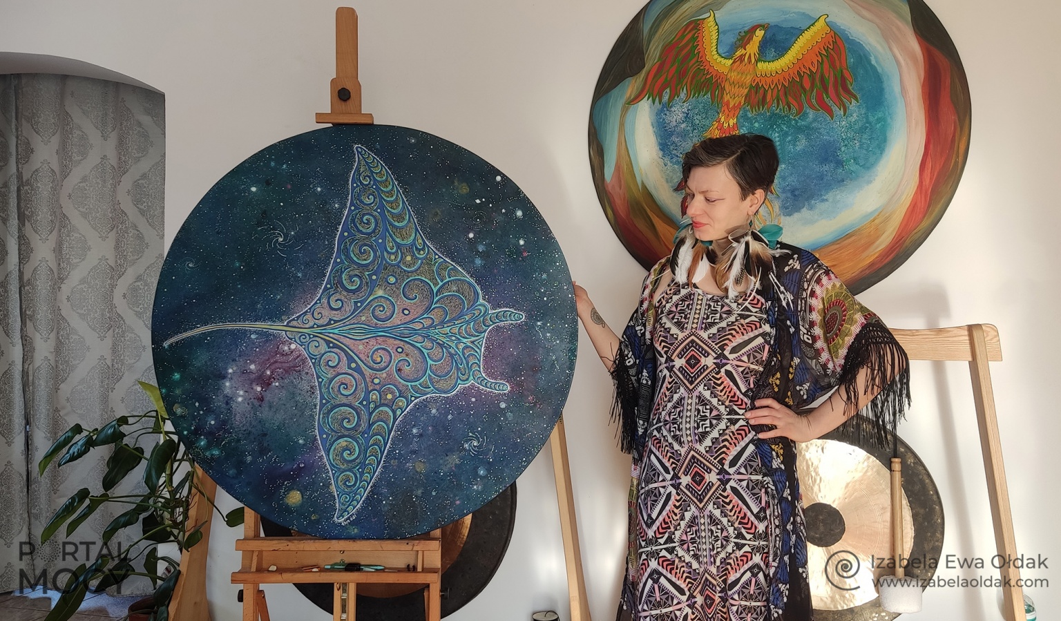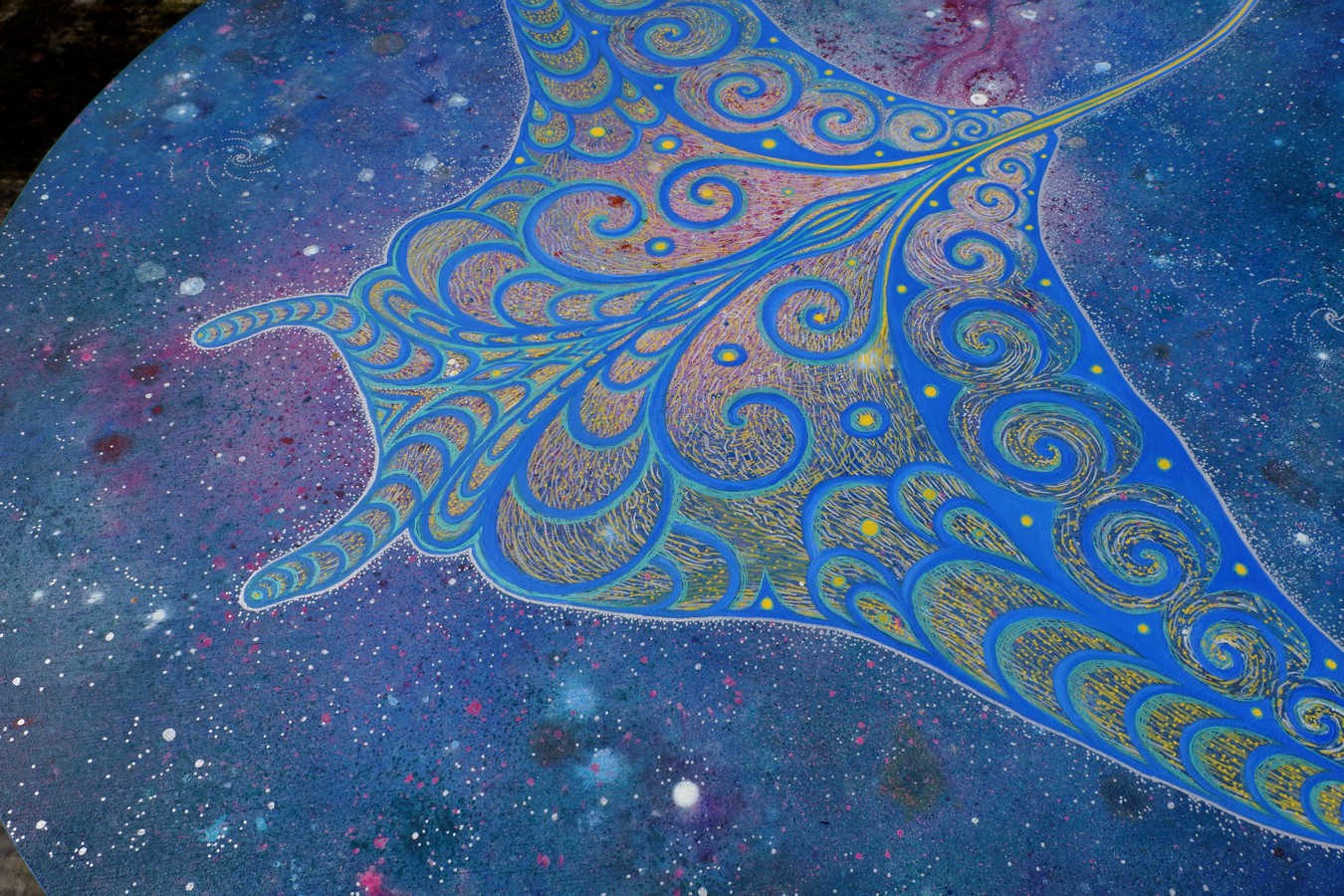 Kosmiczna Manta Ray to monumentalne tondo o średnicy jednego metra, w którym Izabela Ołdak łączy duchowość natury z mistyką kosmicznej przestrzeni. W centrum kompozycji unosi się majestatyczna płaszczka (manta ray) – symbol swobody, podróży między wymiarami i łagodnej mocy oceanu.