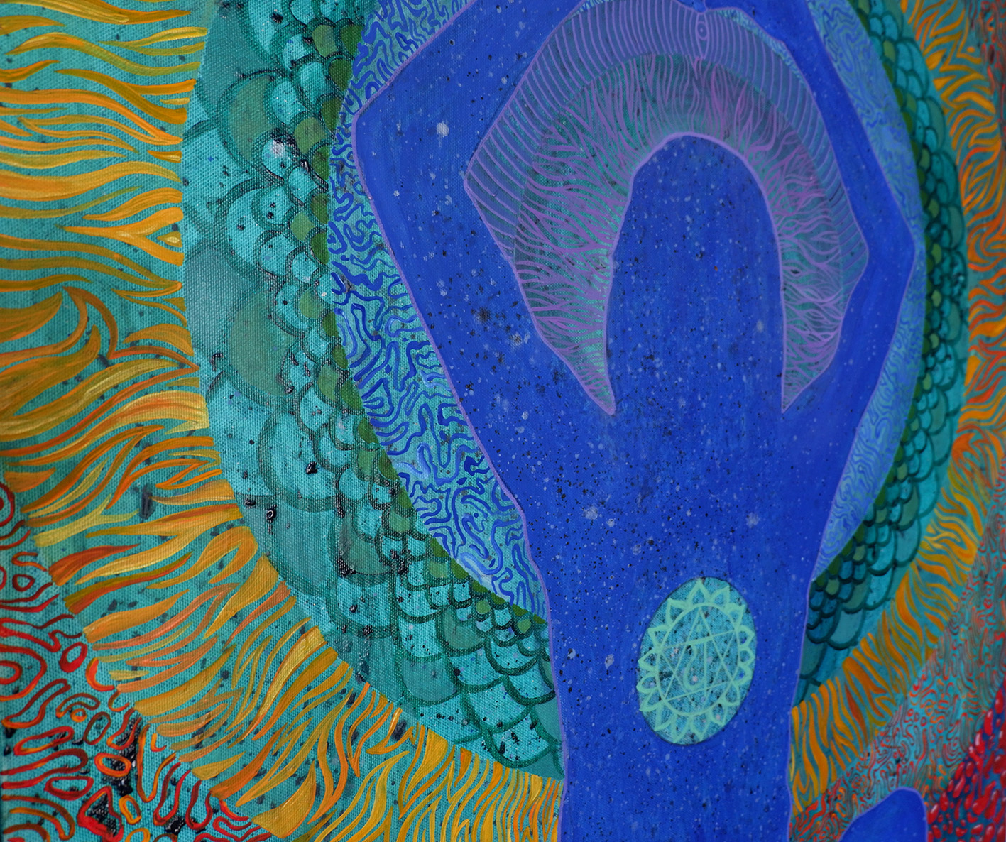 Z przyjemnością przedstawiamy państwu obraz "Medytacja Serca". Jest to wyjątkowe dzieło sztuki, które przedstawia kobietę wpisaną w mandale pełną żywych, psychodelicznych wzorów, odpowiadających kolorom czakr.