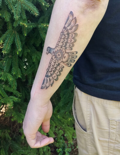 Ponieważ od wielu lat kroczę szamańską ścieżką, ucząc się rozmaitych technik uzdrawiania, pracy z bębnem i przewodnikami duchowymi, postanowiłam połączyć ten talent z tatuowaniem. Dlatego w mojej ofercie znajdują się tatuaże intencyjne, tatuaże mocy czy szamańskie ceremonialne sesje. Nie jest to zatem zwykły tatuaż lecz rezultat uzdrawiającej sesji, niosący osobiste przesłanie i moc.